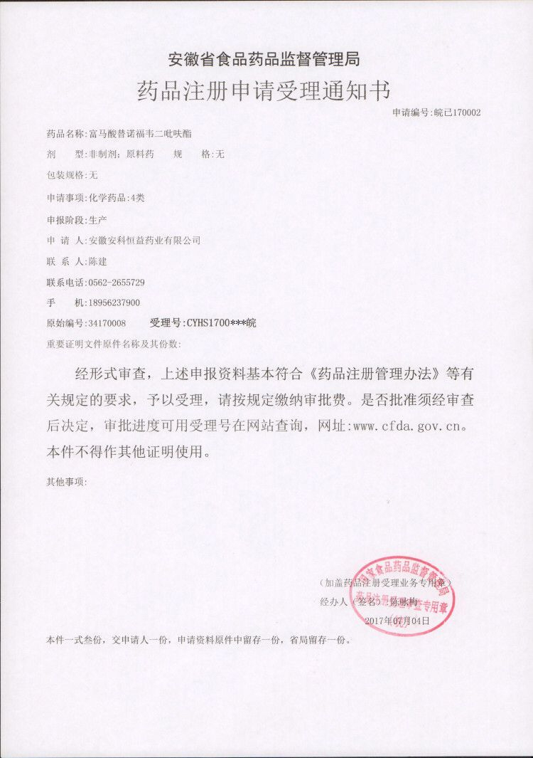 2017年7月4日,安徽安科恒益藥業有限公司新藥品種——富馬酸替諾福韋二吡呋酯及富馬酸替諾福韋二吡呋酯片申請生產注冊,已取得藥品注冊申請受理通知書。