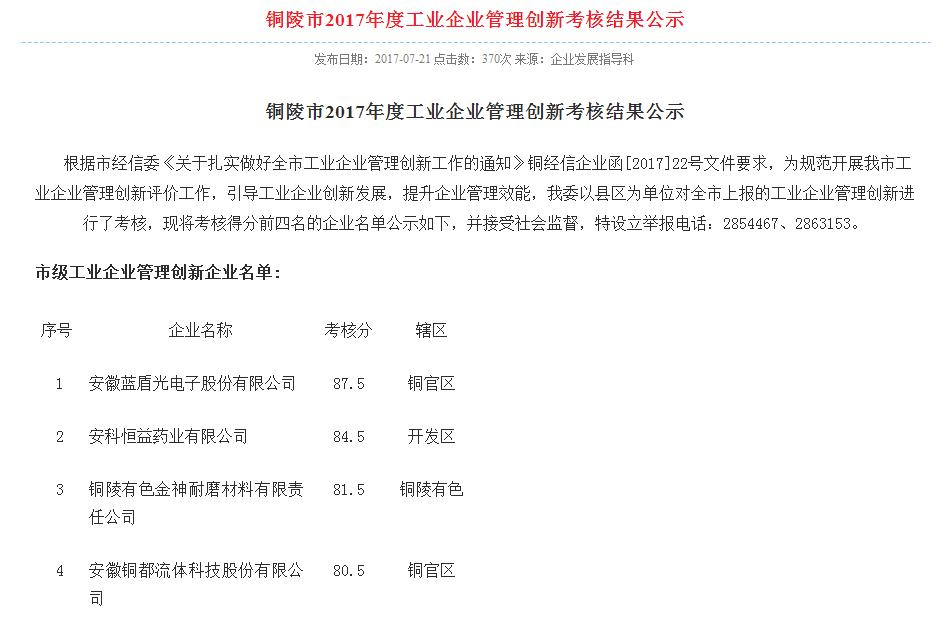 2017年度工業(yè)企業(yè)管理創(chuàng)新考核結(jié)果公示安科恒益榜上有名