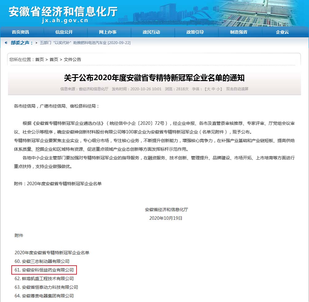 近日,安徽省經濟和信息化廳公布了 2020 年度安徽省專精特新冠軍企業名單,我公司入選安徽省專精特新冠軍企業。