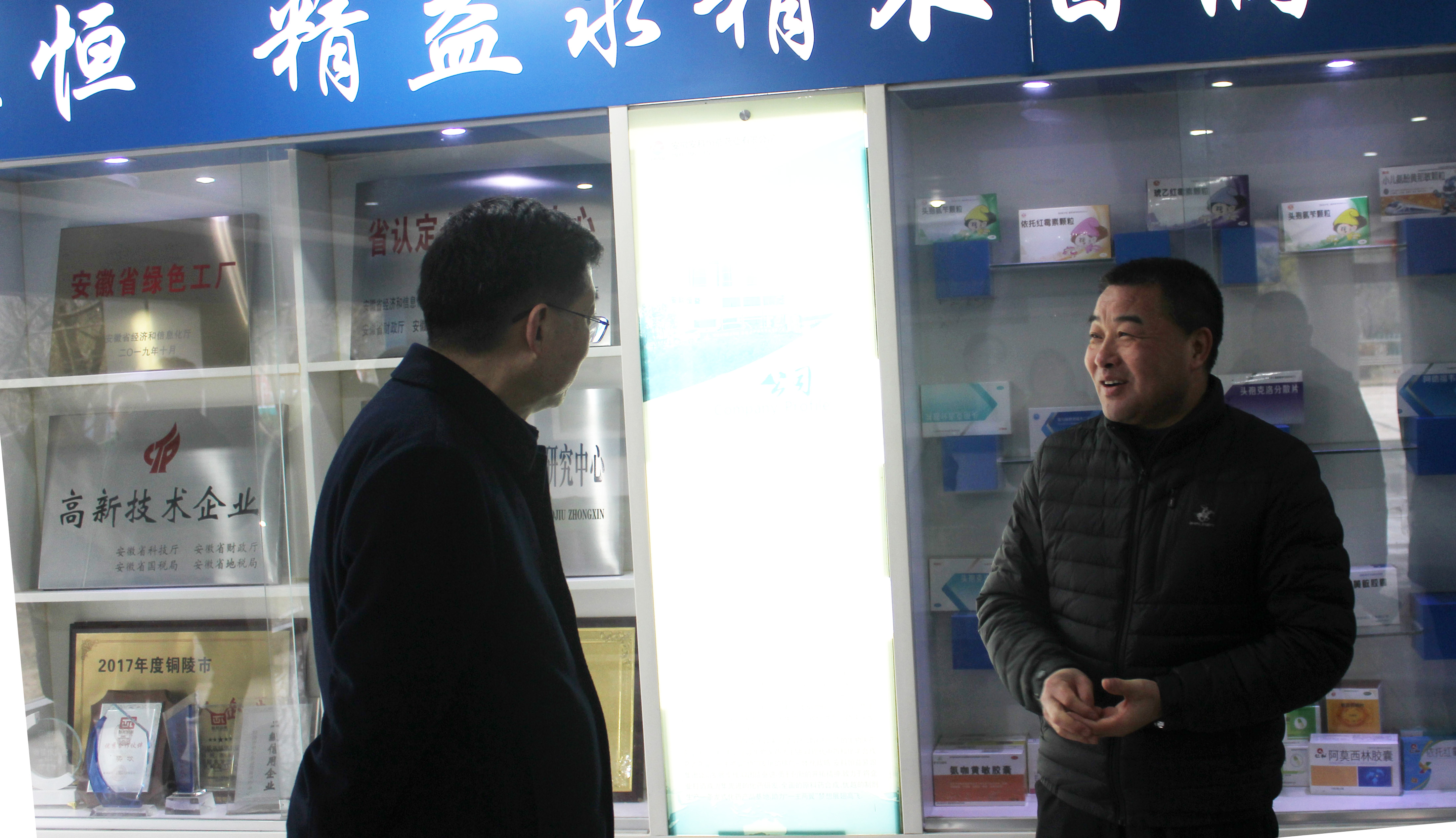 在公司會議室,朱衛兵總經理向劉亞東主席一行介紹了企業近幾年研發品種、仿制藥、大健康產品品種建設等方面情況,并就企業存在的新產品增加后倉庫庫容不夠、擴品招商等建議與劉亞東主席進行了交流。